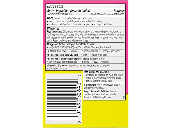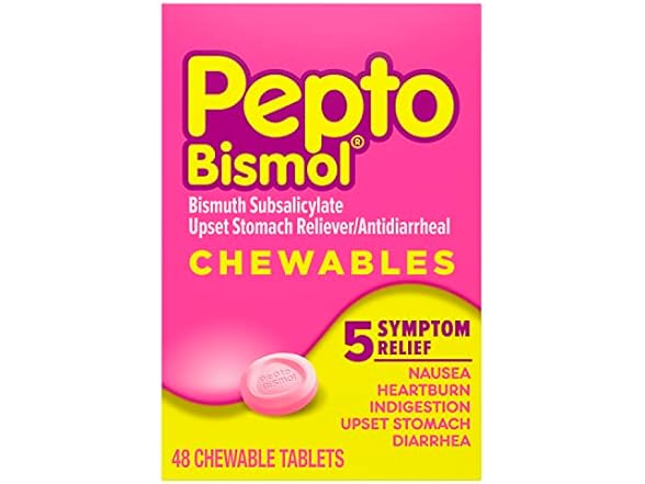 In the Box: (1) Pepto Bismol Chewable Tablets for Nausea, Heartburn, Indigestion, Upset Stomach, and Diarrhea - 5 Symptom Fast Relief, Original Flavor, 48 ctSpecs