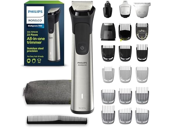 (1) Philips Norelco Multigroom 7000 Series, All-in-One Trimmer, Beard Trimmer and Hair Clipper, 23-Piece Men's Grooming Kit for Beard, Face, Nose, Ear, Body, with Titanium Blades, Travel Pouch, MG7970/49