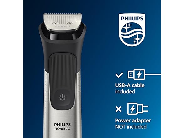 - The set includes: 1x Multigroom handle and a set of attachments and combs for face, head and body trimming - see the what's in the box section; 1x USB-A charging cable (power adapter not included)