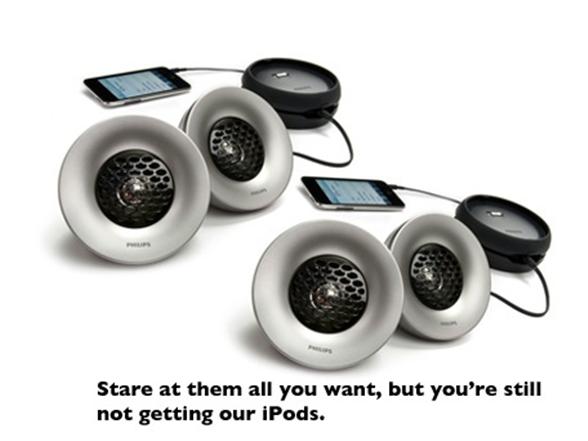 Jeez, just because a guy has to tape a Philips Portable Speaker System to his chest doesn’t mean he’s giving you permission to just glare at it like some wanton freak, alright? It’s rude, okay? And not to mention a little weird. Now, as I was saying, Larry was talking about…
