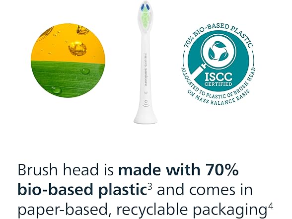Reach a more radiant smile with these clinically tested teeth-whitening Philips Sonicare toothbrush heads. Notice results after just one week while experiencing an exceptional everyday clean. The diamond-shaped bristle area is designed to increase surface contact and clean away stains more effectively. The results speak for themselves with up to 100% more stain removal in less than two days². The W DiamondClean electric toothbrush heads are also very efficient when it comes to plaque removal: they use densely-packed bristles to remove up to 700% more plaque than a manual toothbrush. Trust proven Sonicare technology: the Philips Sonicare toothbrushes clean gently yet effectively and care for your teeth and gums with up to 62,000 bristle movements. Sonicare Fluid Action supports cleaning by driving fluid deep between teeth and along the gumline. All Philips Sonicare sonic toothbrush heads are meticulously designed and clinically tested to meet the highest standard in quality, safety and performance. These electric toothbrush replacement heads are compatible with all Philips Sonicare click-on electric toothbrushes⁵. Dental professionals recommend changing your brush head every 3 months, that's why Philips Sonicare toothbrushes have BrushSync technology. It tracks how often and how hard you brush, and the light on the handle turns on when it's time to replace your brush head.⁷ You will also know when to replace it when blue bristles turn white. ¹ vs. a manual toothbrush ² in white mode vs. a manual toothbrush ³ allocated to plastic of brush head on mass balance basis ⁴ where facilities exist ⁵ not compatible with Philips One and e-series handles ⁶ in hard-to-reach areas ⁷ the feature is available for BrushSync compatible handles