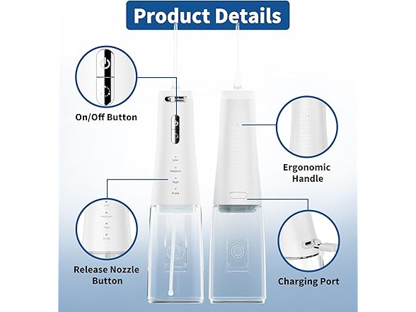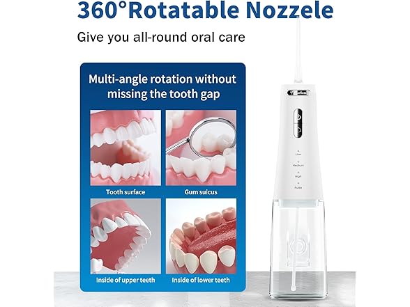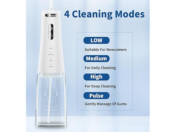 - Adjustable Intensity: Choose from low, medium, and high pressure settings to customize your flossing experience.