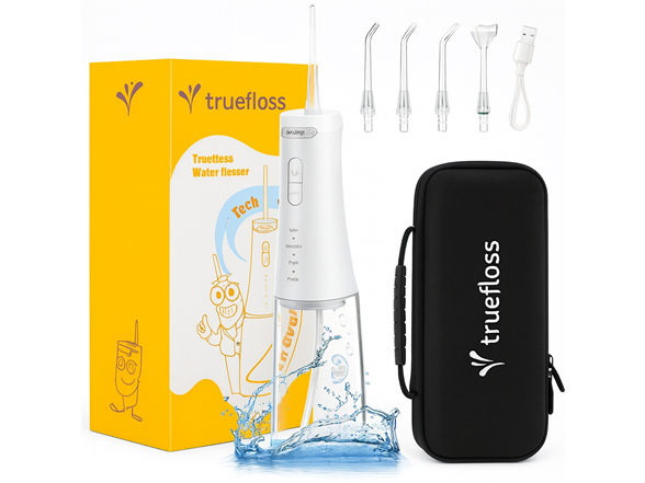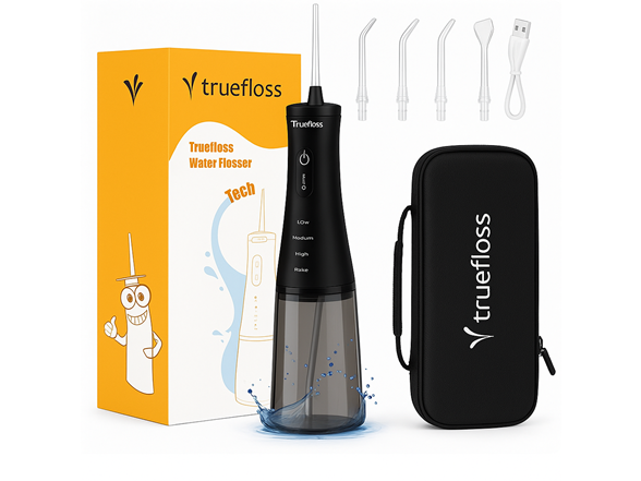 Truefloss Cordless Water Dental Flosser, 4 Modes 4 Jet Tips Replacement, IPX7 Waterproof,300ML Removable Water Tank Powerful Battery &Type-C Charge Oral Irrigator for Business Travel