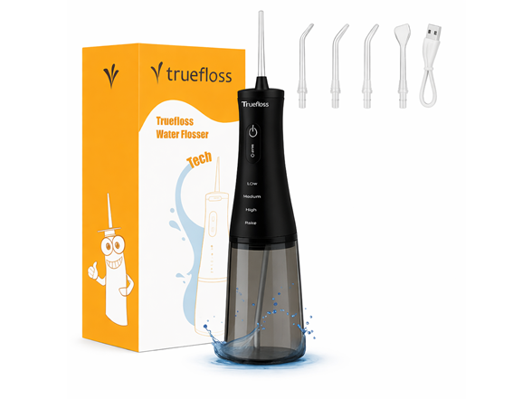 Truefloss Cordless Water Dental Flosser, 4 Modes 4 Jet Tips Replacement, IPX7 Waterproof,300ML Removable Water Tank Powerful Battery &Type-C Charge Oral Irrigator for Business Travel