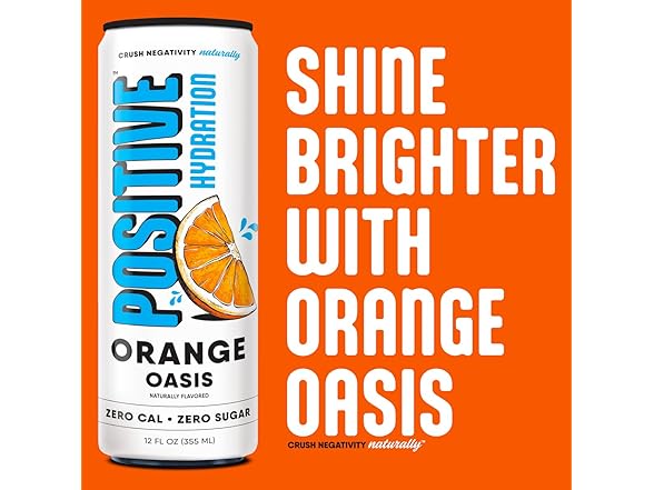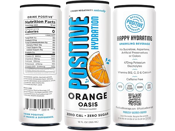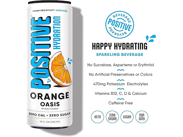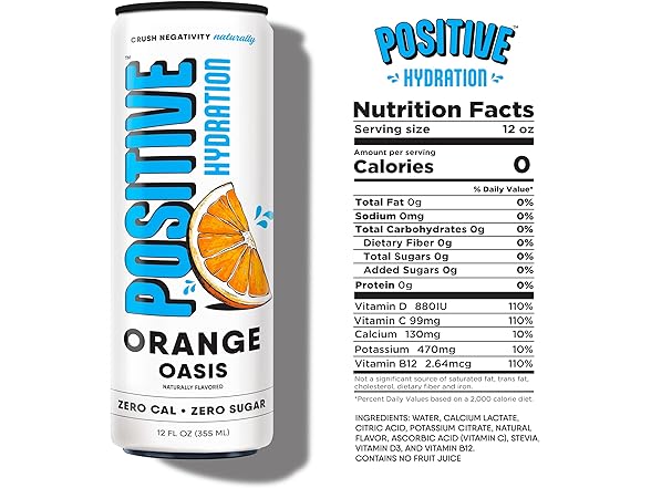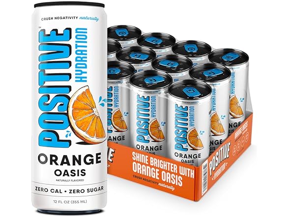 In the Box:- (1) Positive Hydration Electrolyte Beverage - Orange Oasis | Zero Calorie, Vitamin-Enhanced, 12-oz Cans (Pack of 12) | Healthy Hydration with Calcium & Electrolytes