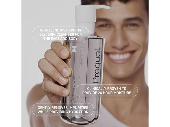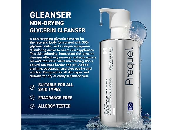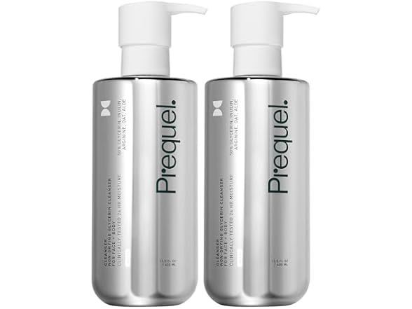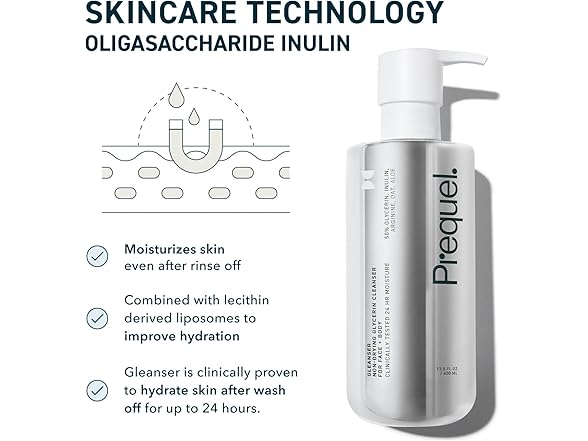 Prequel Skin Gleanser, Glycerin Body and Face Cleanser for 24-Hour Clinically-Proven Hydration. Put your skin health first with Prequel Skin Gleanser, a dermatologist-developed solution with 50% Glycerin, inulin, and a unique aquaporin-stimulating active to boost skin suppleness. Delivers clinically proven 24-hour hydration, to create a powerful skincare story. YOUR SKIN STORY: Dry, oily, combination or sensitive skin seeking deep hydrating cleanser SKIN SOLUTION: Gleanser for clinically proven hydration, and deep cleansing Clinically proven 24-hour moisture retention Deep cleansing of makeup, oils, and impurities without drying The non-stripping formula supports natural skin barrier function and hydration levels Cleanses and purifies signs of congestion Formulated as a dual face wash and body wash Oat extract, Aloe Vera, and Arginine condition skin while soothing Two (2x) 13.5oz Pump Bottles, great value. HOW TO USE: Apply 1-2 pumps to wet skin and lather. Follow up with Prequel Skin serum, moisturizer, and sunscreen as needed. Store at room temperature, and away from direct sunlight. Suitable for daily use to help support 24-hour hydration and moisture levels. Prequel Skin: Dermatologist-Developed, Clinically Tested Skincare for Women and Men pH-stabilized Pure ingredients Clinically tested Allergy tested Non-comedogenic Our unique blend features a 50% glycerin concentration combined with Oligosaccharide Inulin and specialized liposomes to enhance moisture retention. Aquaporin-stimulating actives work to maintain optimal hydration levels while preserving your skin's natural barrier function. Fragrance-free. Your Skin Tells Your Story. Prequel Rewrites It.