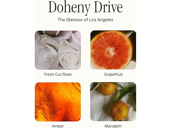 - SCENT NOTES: Doheny Drive evokes the sunlit charm of a Beverly Hills bungalow, blending vibrant citrus with elegant floral notes. Scent notes of fresh grapefruit, mandarin, rose & musk