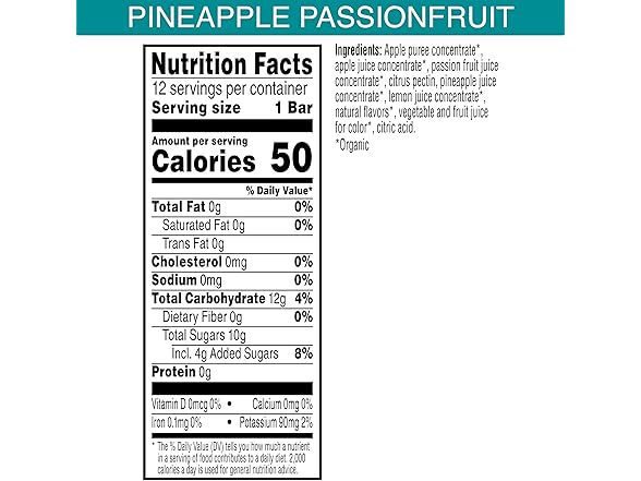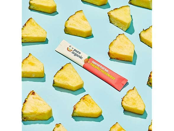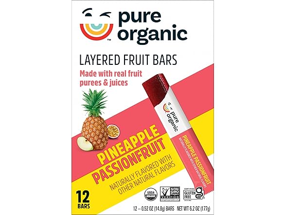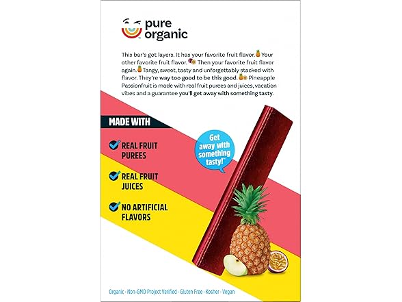 - Satisfy your sweet tooth with Pure Organic Pineapple Passionfruit Layered Fruit Bars, a fruit snack made with no cane sugar or syrup