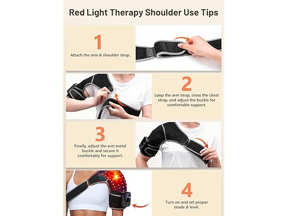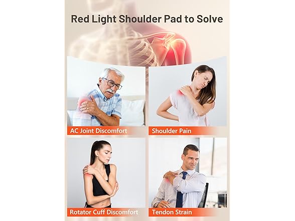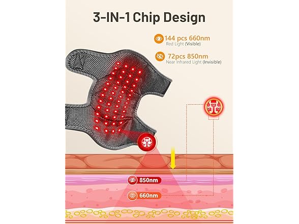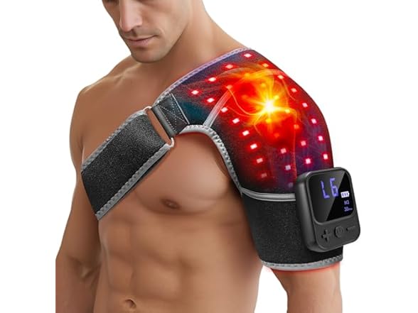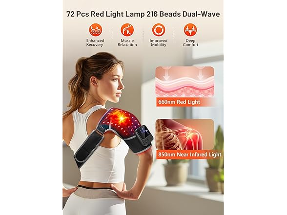 - Red Light Therapy for Shoulder: This advanced shoulder wrap features 72 precision lamp beads, each emitting both dual 660nm red light and invisible 850nm near-infrared wavelengths. The 660nm red light works with surface tissues to help ease shoulder discomfort and tension, while the 850nm near-infrared wavelengths reach deeper into muscle and joint areas, supporting the release of stiffness and promoting comfortable mobility.