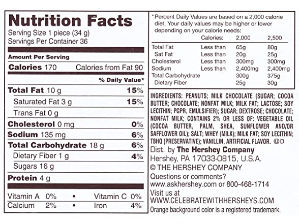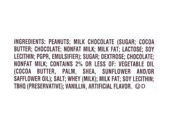 Ingredients: PEANUTS, MILK CHOCOLATE (SUGAR, COCOA BUTTER, CHOCOLATE, SKIM MILK, MILK FAT, LACTOSE, LECITHIN (SOY), PGPR), SUGAR, DEXTROSE, CONTAINS 2% OR LESS OF: VEGETABLE OIL (PALM OIL, SHEA OIL, SUNFLOWER OIL, PALM KERNEL OIL, &/OR SAFFLOWER OIL), SALT, CHOCOLATE, WHEY (MILK), SKIM MILK, LECITHIN (SOY), TBHQ & CITRIC ACID (TO MAINTAIN FRESHNESS), VANILLIN (ARTIFICIAL FLAVOR).