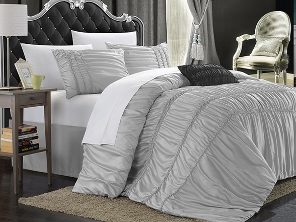 Luxury Comforter Set Romantica features technique style pleating on this designer looking bedding set. In addition with fashionable Décor Pillow and Shams creating elegant bliss. Front of comforter and pillow shams made of mat satin fabric, back of comforter and pillow shams made of 90 GSM microfiber. Decorative pillow made of mat satin fabric to match.