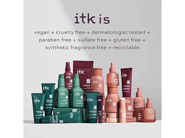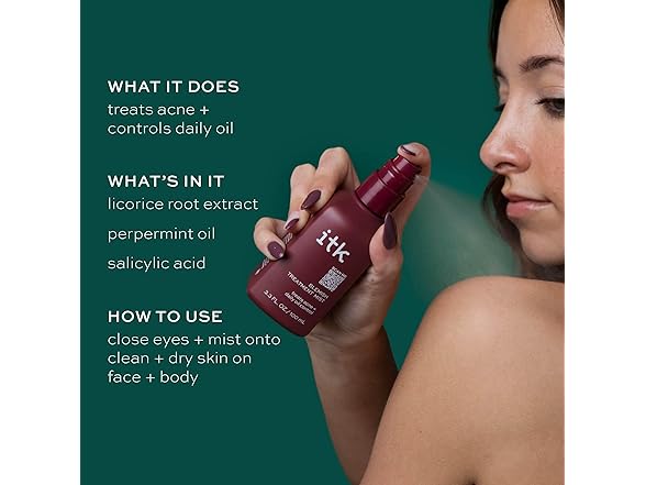 ITK Blemish Treatment Mist: Licorice root extract: calms skin+ brightens dark spots; Salicylic acid (BHA): an exfoliating agent that helps reduce the appearance of blemishes; Peppermint oil: provides a soothing cooling effect on application