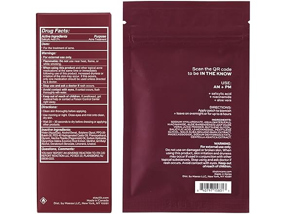 ITK Microneedle Blemish Pimple Patches: Salicylic acid (BHA): an exfoliating agent that helps reduce the appearance of blemishes; Niacinamide: helps brighten dark spots; Aloe vera: calms the skin; Hydrocolloid: targets bacteria