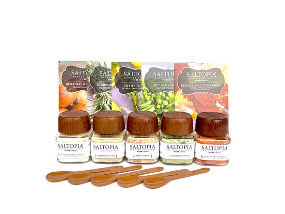 Culinary Favorites for all Levels of Cooking Gift Set” has been carefully selected to feature the top flavors used by professional chefs, while still being entirely useful for folks who are simply learning to boil water. The set includes 5 “must have” flavors such as onion, rosemary, paprika and citrus which elevate kitchen standards for adding that special pinch to any dish – even scrambled eggs! Each set includes five 3.4oz glass jars of SALTOPIA Infused Sea Salts for all levels of cooking; plus 5 recipe cards with 3 recipes per flavor included; 5 SALTOPIA signature spoons - all beautifully packaged in "ready to gift" boxes with a corresponding themed wrap/sleeve making the set extra special! Our products are 100% pure and made in the USA. Shelf life is 3 years from the date of the receipt. Store cool & dry.