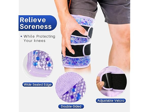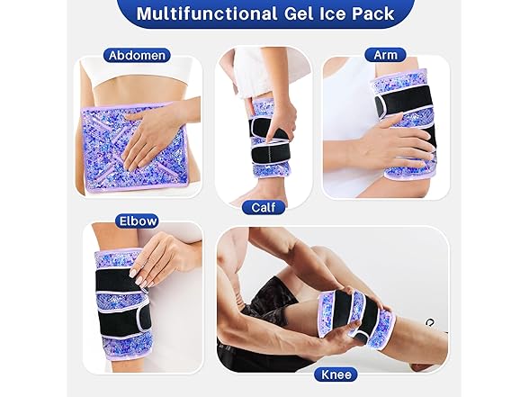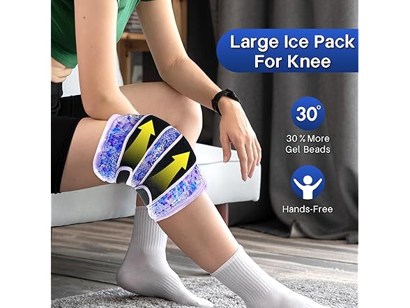 - Gel Ice Pack for Knees--The gel knee ice pack provide swift relief from pain and inflammation, making them essential for post-surgical recovery, sports injuries, and arthritis management. The ergonomic design ensures a secure, contouring fit around the knee, delivering targeted cooling directly to the source of discomfort. This prompt relief accelerates recovery and the return to daily activities, particularly benefiting athletes, seniors, and individuals in rehabilitation. The cold knee wrap offer a practical solution for managing both acute and chronic knee pain.