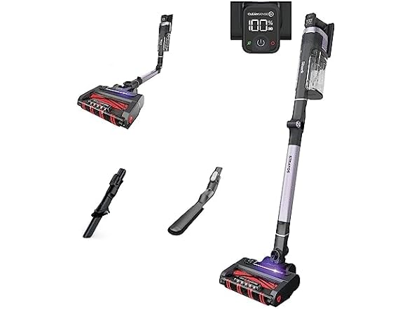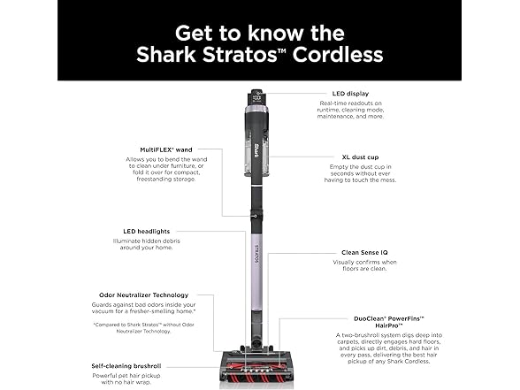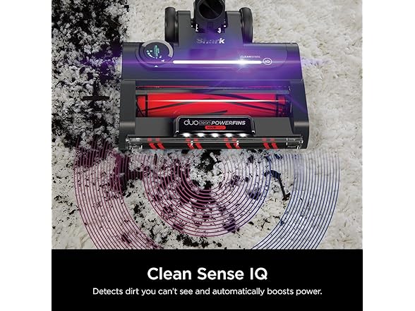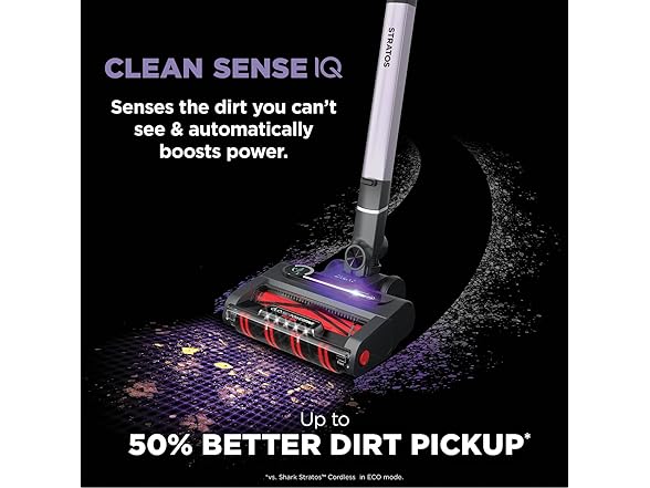 - CLEAN SENSE IQ: Infrared sensor detects the dirt you can’t see and automatically increases power, giving you up to 50% better* dirt pickup. The Clean Sense IQ indicator visually shows when floors are clean. (vs. Shark Stratos Cordless in ECO Mode.)