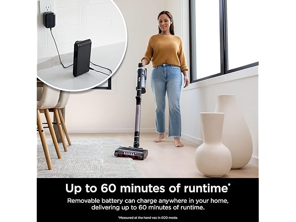 - UP TO 60 MINUTES OF RUNTIME: Removable battery can charge anywhere in your home, delivering up to 60 minutes of runtime. (In ECO mode, measured at the hand vacuum.)