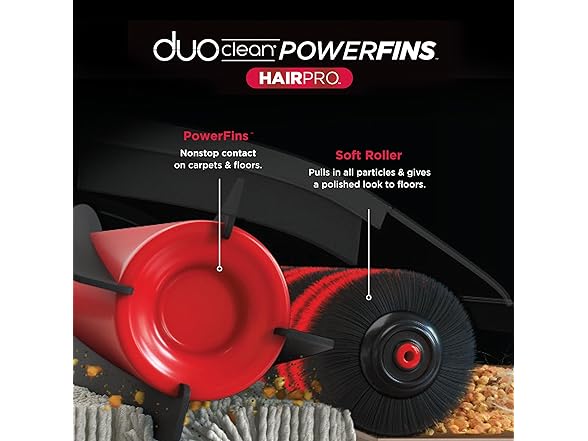 - DUOCLEAN POWERFINS HAIRPRO: Two brushroll system digs deep into carpets, engages hard floors, and picks up dirt, debris, and hair in every pass. No cordless vacuum picks up hair better*. (*From floor to dust cup, third party tested on human/pet hair)