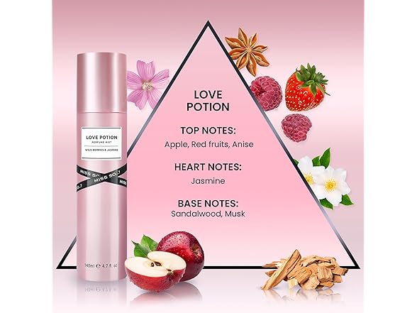 - Intriguing Scent Profile: Our Love Potion Perfume Mist is a women's perfume with a unique blend of musky, woody, floral, and fruity notes and top notes of apple, red fruits, and anise.
