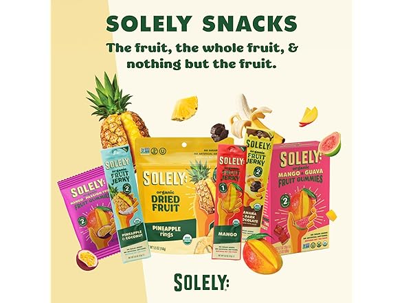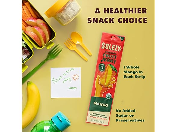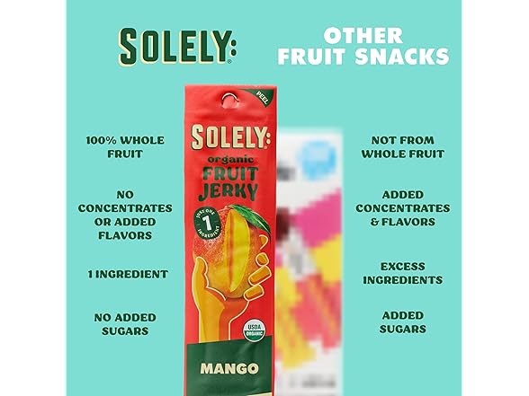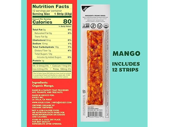 In the Box: (1) Solely - Organic Mango Fruit Jerky - 12 Individually Wrapped Fruit Strips - Fruit Leather Made from Dried Fruits - Healthy Snacks, Vegan - 0.8oz (23g)Specs