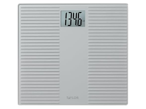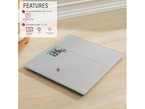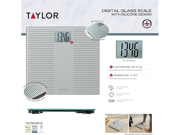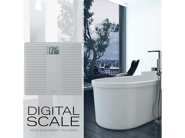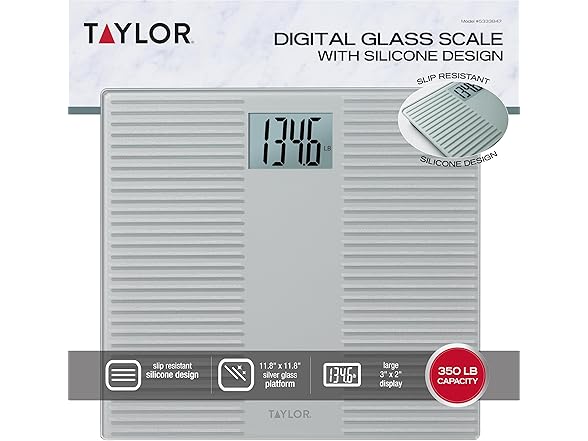 In the Box: (1) Taylor Digital Bath Scale, Durable Anti-Slip Silicone Platform, All Grip, No Slip, Safe, Easy to Read Weight Measurements, 2 AAA Batteries Required & Included, 350 lb Capacity, Silver