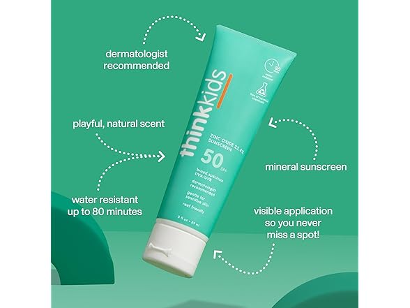 Thinksport Kids SPF 50+ Natural Mineral Sunscreen, Safe for Children - Water Resistant – Broad Spectrum UVA/UVB Sun Protection – Reef Friendly Sun Lotion. Enjoy the sun with your kids year-round with Thinksport Kids SPF 30 Mineral Sunscreen, made with natural ingredients. Gentle on sensitive skin, this sun block is a powerhouse against harmful rays. Our mineral-based formula goes on smoothly, and is absorbed easily without feeling sticky or goopy. With broad-spectrum protection that begins instantly, with no unpleasant fragrance or chemicals. Lightweight and sized just right, our sunscreen is a guardian for those sunny adventures, for safe sun play, everyday. You can apply this sun cream to all areas that will be exposed to the sun, including the face, shoulders, ears, neck, hands, feet and scalp. Reapply every two hours or more as needed. With water resistance of up to 80 minutes, your children will have protected fun in the sun. Formulated with 24.25% Zinc Oxide, it's the sun screen protector for face and body, safeguarding skin against UVA and UVB rays. No PABA, parabens, phthalates, BPA, oxybenzone, avobenzone, petroleum, gluten, dairy. Curtly Free. We are guided by the 'Precautionary Principle' for every product we bring to market.