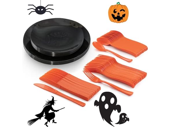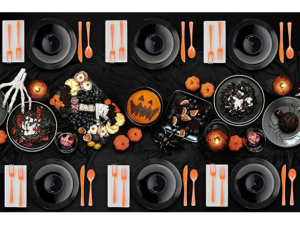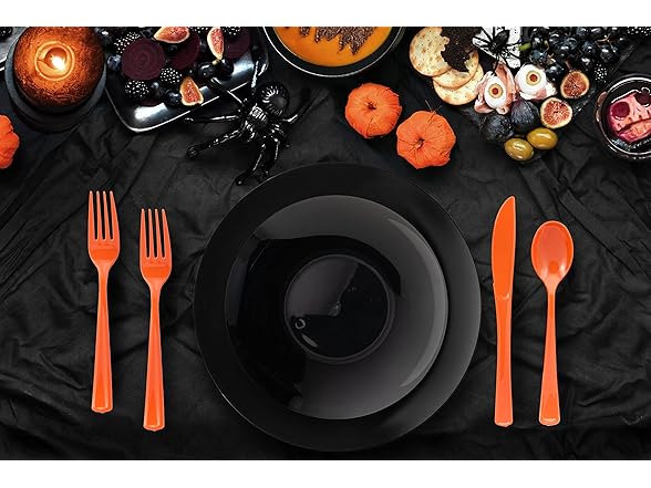 - ✔️ PERFECT FOR HALLOWEEN: Try Not To Flex Too Hard With These Stunning Classy Halloween Themed Black Plates And Orange Cutlery Combo. Your Halloween Guests At Your Halloween Party Will Be Floored By The Beautiful Presentation That These Fancy Trendy And Sturdy Halloween Plate Sets With Cutlery Will Make . After Your Epic Halloween Party Is Over All You Need To Do Is To Simple Dispose! And For Those Feeling Green, Although We Do Advertise As Disposable These Can Be Hand Washed And Reused Again.