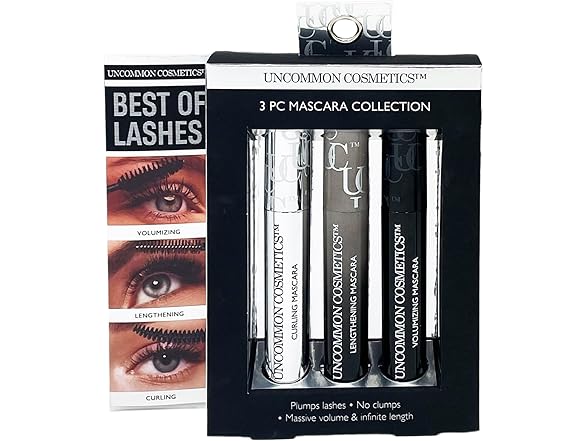 Introducing Uncommon Cosmetics' Best Of Lashes Mascara Collection Set - possibly the finest selection of mascaras you'll ever need. This gift set offers a collection of expertly crafted formulas, each designed to deliver lash mascara that adds curling, lifts, and lengthening effects to your lashes. The unique formula ensures your lashes stay volumized and bold all day without smudging or flaking.