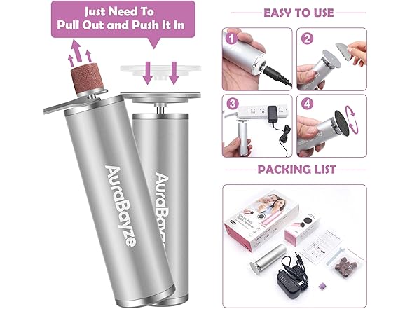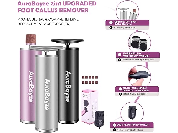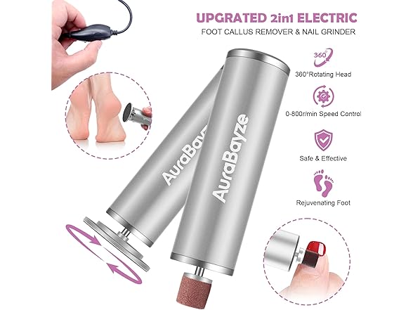 - UPGRATED 2 in 1 ELECTRIC FOOT CALLUS REMOVER AND NAIL GRINDER. AuraBayze electric foot callus remover make it super easily and effectively remove rough, dry, and dead skin on your feet with a comfortable way. Upgraded to dual-use, The discs are easy to change out to nail grinder, just need to pull out and push it in. Making your at-home foot care routine feel professional!