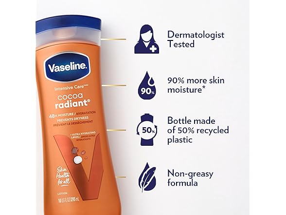 - FOR A LONG-LASTING GLOW: Vaseline Intensive Care Cocoa Radiant Lotion for dry skin moisturizes skin for a long-lasting, radiant glow.