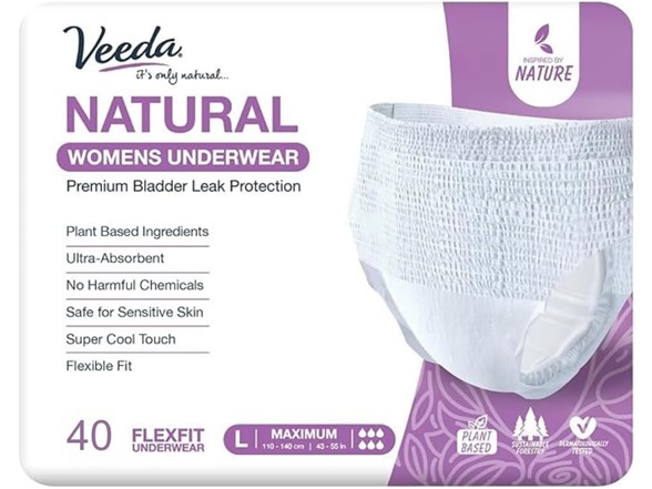 Veeda Natural Adult Incontinence Underwear for Women - Postpartum Underwear for Bladder Leakage Protection - Disposable Underwear with Maximum Absorbency - Large Size - 40 Count