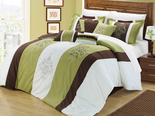 Color block piecing add texture, color and a tailored look along side opulent embroidery design. This bedding is amazingly crafted and offers a traditional yet updated masterful look. Array of colors and coordinating accent pillows gives you everything to complete the look. Soft green and brown tones add color and texture to any room design.