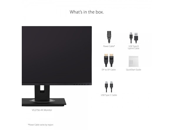 Display Size (in.)27 Panel TypeIPS Resolution3840 x 2160 Static Contrast Ratio1,000:1 DisplayDisplay Size (in.)27 Viewable Area (in.)27 Panel TypeIPS Resolution3840 x 2160 Resolution Type4K (3840x2160) Static Contrast Ratio1,000:1 Dynamic Contrast Ratio50,000,000:1 Light SourceLED Brightness350 cd/m2 Colors1.07B Color Space Support8+2 bits Aspect Ratio16:9 Response Time (Typical GTG)14ms Response Time (GTG w/OD)5ms Backlight Life (Hours)30,000 Panel SurfaceAnti-glare, Hard coating (3H) CompatibilityPC Resolution (max)3840 x 2160 Mac® Resolution (max)3840 x 2160 ConnectorUSB Type A2 USB Type B1 USB Type C1 Ethernet LAN (RJ45)1 HDMI 2.0 In1 DisplayPort1 AudioInternal Speakers2W (x2) PowerEco Mode (Conserve)16.8W Eco Mode (optimized)21.2W Consumption (typical)30.7W Consumption (max)70.0W VoltageAC 100-240V (universal), 50-60Hz Stand-by0.5W Power SupplyInternal Additional HardwareKensington Lock Slot1 ControlsPhysical Controls1,2,3,4,5,6 (Power) On Screen DisplayAuto Image Adjust, Contrast/Brightness, Input Select, Audio Adjust, Color Adjust, Information, Manual Image Adjust, Advanced Image Adjust, Setup Menu, Memory Recall (See user guide for complete OSD functionality) Operating ConditionsTemperature32-104º F (0 - 40º C) Humidity (non-condensing)20-90% MountVESA Compatible100 x 100 mm Video SignalFrequency Horizontal15 ~ 150 KHz Frequency Vertical24 ~ 75 Hz Video InputDigital SyncTMDS for HDMI (v2.0), PCI-E for DisplayPort (v1.2), Micro-Packet for USB Type C ErgonomicsHeight Adjust130 mm / 5.1 in Swivel120º Pivot (Right/Left)90º / 90º Tilt (Forward/Back)40º / 5º Weight (imperial)Net (lbs)16.5 Net Without Stand (lbs)11.2 Gross (lbs)23.6 Weight (metric)Net (kg)7.5 Net Without Stand (kg)5.1 Gross (kg)10.7 Dimensions (imperial) (wxhxd)Packaging (in.)27.2 x 8.6 x 16.9 Physical (in.)24.1 x 16.0 x 8.0 Physical Without Stand (in.)24.1 x 14.3 x 2.0 Dimensions (metric) (wxhxd)Packaging (mm)692.0 x 218.0 x 430.0 Physical (mm)613.0 x 406.0 x 202.0 Physical Without Stand (mm)613.0 x 363.0 x 52.0 GeneralRegulationscTUVus, FCC-B, ICES003, Energy Star Certified, EPEAT Certified, MX-CoC, Mexico Energy PACKAGE CONTENTSVG2756-4K, Power Cable, DP to DP Cable, USB Type C cable, USB Type B Uplink Cable, Quick Start Guide Recycle/DisposalPlease dispose of in accordance with local, state or federal laws. |