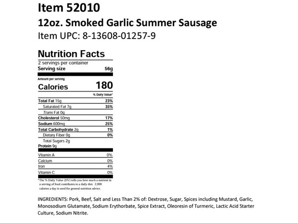 - 12 oz GARLIC Naturally Smoked Summer Sausage spiced to perfection with a rich, smoky hickory flavor distinction