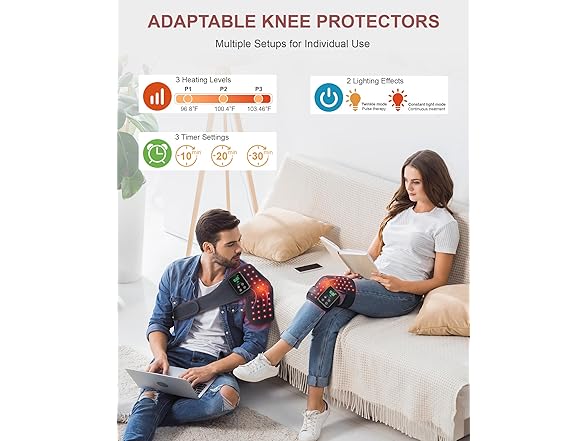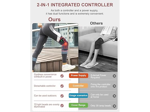 - 【Increased 50% Irradiation from 72 Efficient 3 in 1 LED】Our red light therapy knee pads feature 72 highly efficient 3-in-1 LED beads, covering an area of around 12*12*4 cm². In contrast, many products on the market have less than 30 beads only in the front of the knee. Ours not only doubles the coverage area but also has an ergonomic design. This infrared red light therapy device wraps and irradiates your knee in a 3D all-round way with continuous light and energy from 4 angles. Our heated knee brace are more effective and quickly assist the knee in returning to a stable and healthy state
