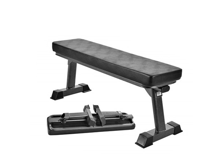 Good size for working out, legs easily fold down to store, very sturdy, comfortable, nice looking, easy to assemble, arrived quickly. Recommend!